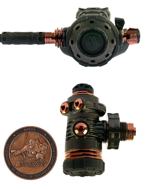 The Apeks MTX-RC 50th Anniversary Limited Edition Regulator is a stunning display of craftsmanship and attention to detail. Adorned with a sleek, black Diamond-Like Carbon (DLC) coating and bronze Physical Vapor Deposition (PVD) accents, this regulator is a true work of art. Each unit is uniquely numbered, making it a collector's item that will be cherished by diving enthusiasts for generations to come.