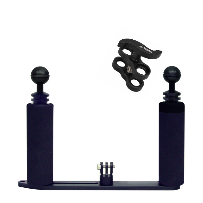 The BigBlue GoPro Camera Tray Kit is a small and compact tray for your action camera that provides stability when shooting. The tray is made from high-grade aluminum material which makes it robust and durable. It also comes with 2 ball mounts to attach accessories such as video lights. The handle is wrapped with neoprene material which makes it super comfortable to hold. The kit also includes a clamp to attach accessories, such as video lights or arms.