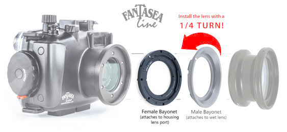 In order to use this system on your housing you will need to purchase a Fantasea Bayonet Male Adapter for the lens you plan to shoot with. For 67mm macro lenses, you'll need the Fantasea Bayonet Adapter for 67mm Macro Lenses (Male), and for the the UWL-09F Wide you'll need the Fantasea Bayonet Adapter for UWL-09F Wide Lens (Male). WIth an adapter on the housing and an adapter on the lens you can then connect the two pieces with a simple 1/4 turn motion for secure and easy use underwater.