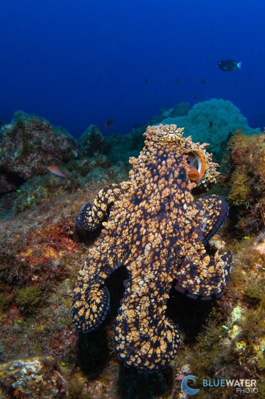 Knowing this, I tend to look for octopus in holes in the side of walls as well as at the bottom of reefs where rock interfaces with sand. Of course, you want to do your research if you have a certain species in mind. Some octopus prefer sandy bottoms and will create their dens with available materials (like clam shells) or even dig into the sand.