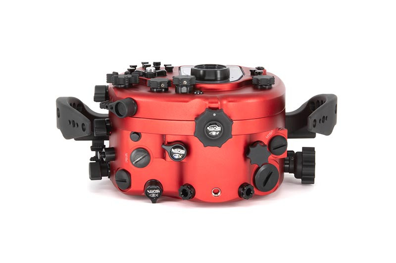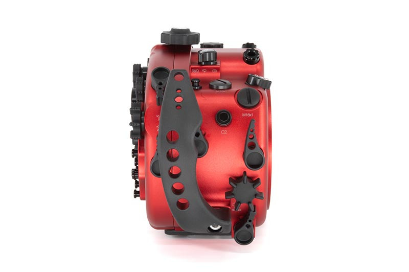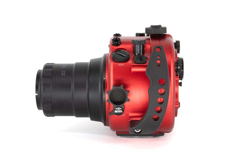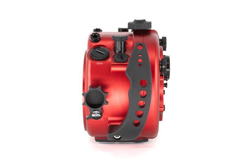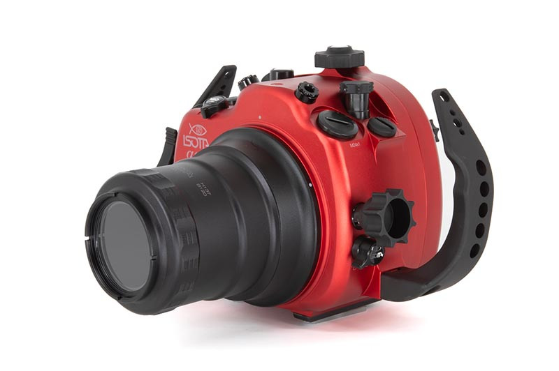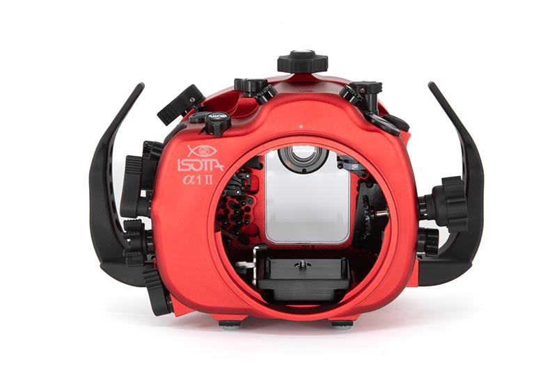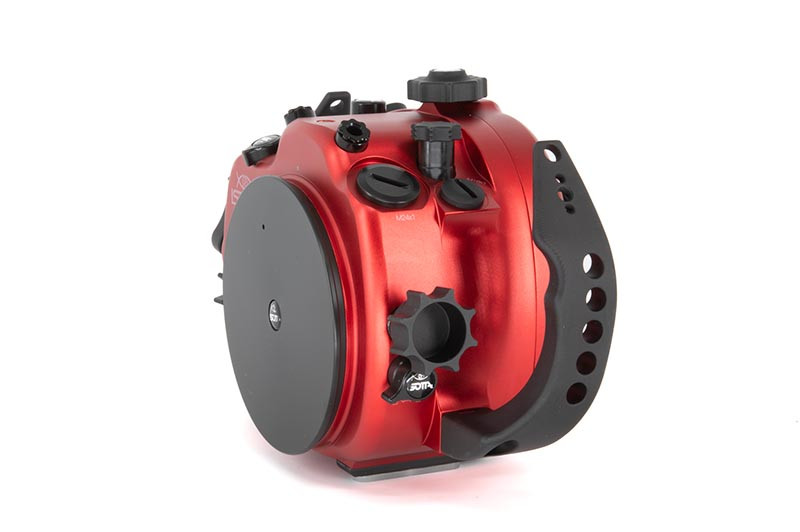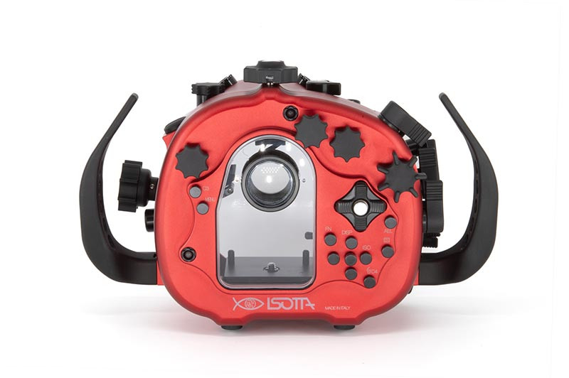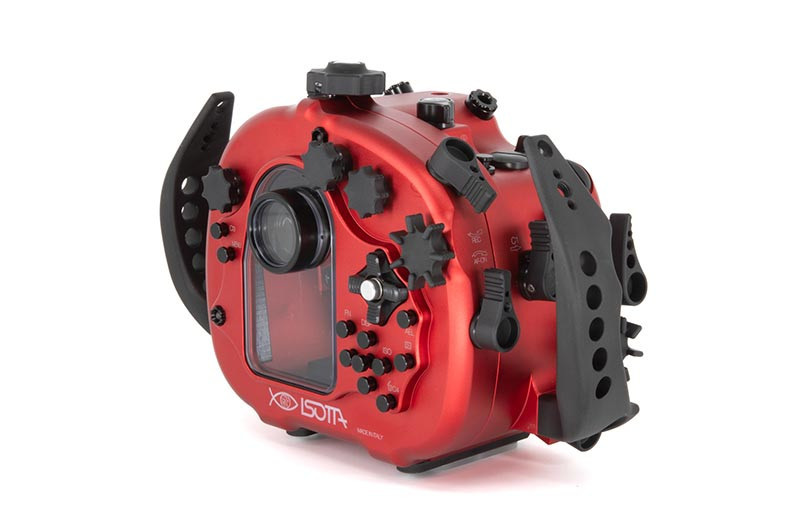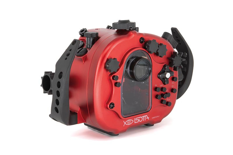 Underwater work is hard on gear: salt, pressure changes, cramped entries, and constant handling. The red anodized aluminum body is built to take that abuse while keeping the control layout crisp and readable. A wide back display viewfinder glass makes it easier to review settings and framing, while the standard ISOTTA viewfinder provides a clear baseline viewing experience for both stills and video. Wide rubber-covered feet help keep the housing steady when you set it down between dives or while adjusting your port and lighting.