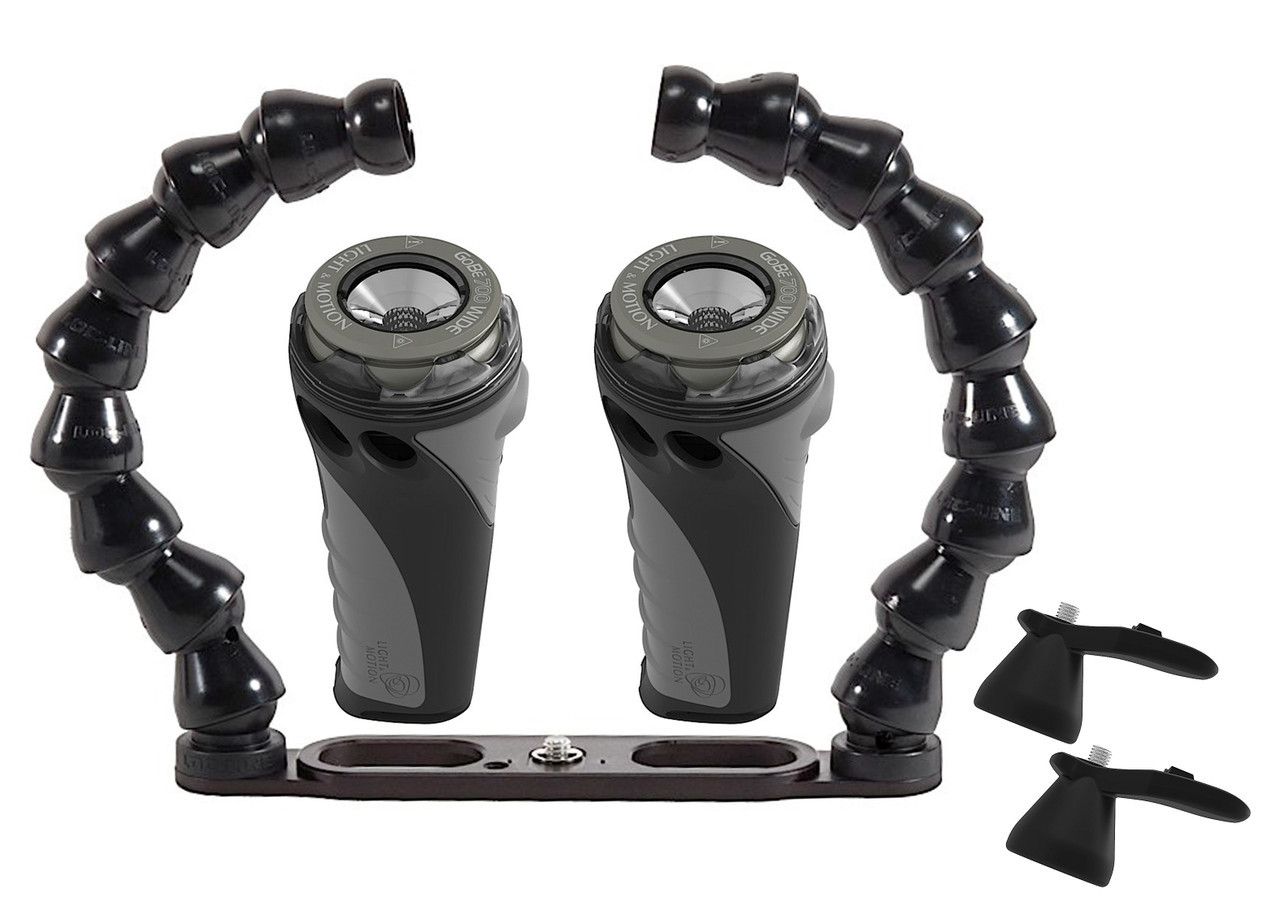 A new high quality dual light set from Light & Motion. This light set is small and compact, with a design that allows you to use it both topside and underater. The various light heads provide high quality even lighting. Interchangeable light heads create an extremely versatile lighting system.
