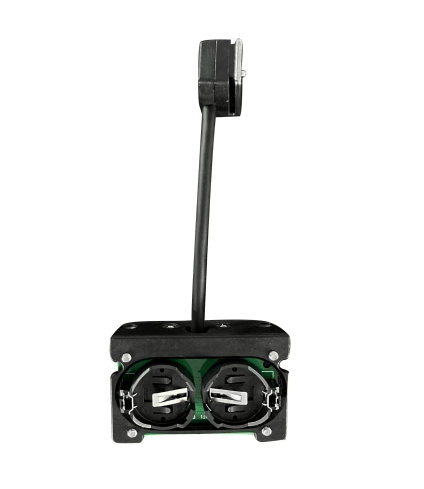 Marelux Manual Flash Trigger for fiber optic support. The trigger is inserted inside the Housing, and is attached to the hotshoe of the camera. This then fires the strobes via fiber optic cables.