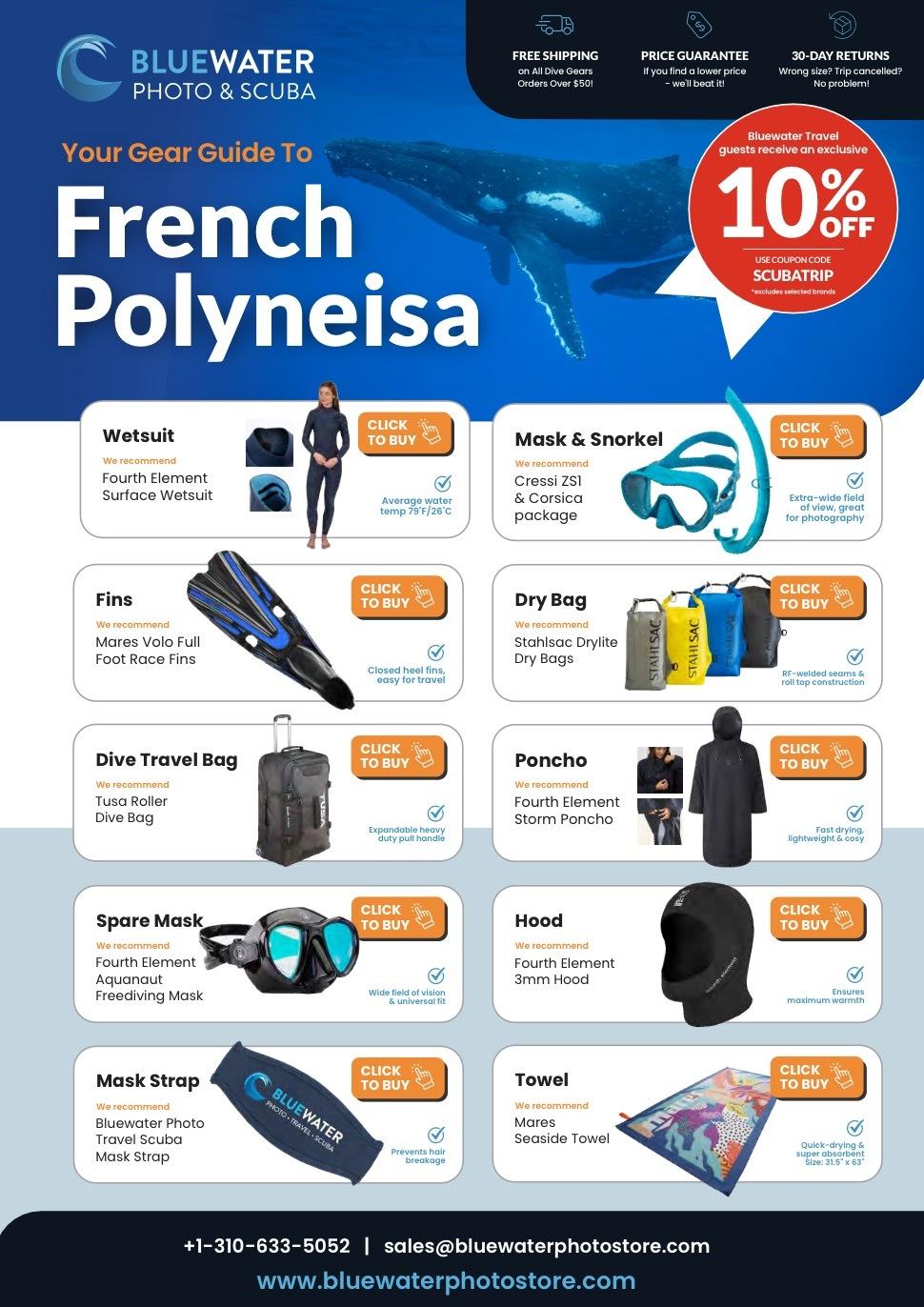 French Polynesia is an island paradise littered with 118 islands to explore, Dive sites vary but boast a large array of fish, reefs , sharks and manta rays. So probably best to pack the wide angle gear for reef vista and big ocean animals.
