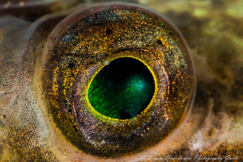 The detail in a 100% crop of the eye of a black-eyed goby from the image above.