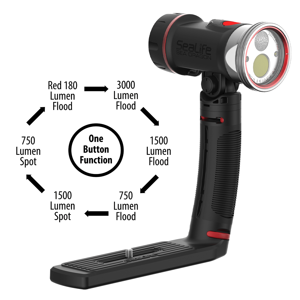 The Sea Dragon 3000SF Dual Beam Video Light included offers 3000 Lumens at 120° wide & 1500 Lumens at 15° spot beam angle. In addition it has a high Color Rendering Index of 90 for wide and 70 for spot. It also has 6 modes - Flood 100%, 50%, 25%; Spot 100%, 50%; One red light mode. It also features a regulated circuitry so light won’t dim when battery power is low.