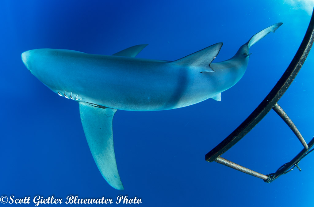A blue shark swims past the swimstep. Photo: Scott Gietler, with the Olympus OM-D E-M1
