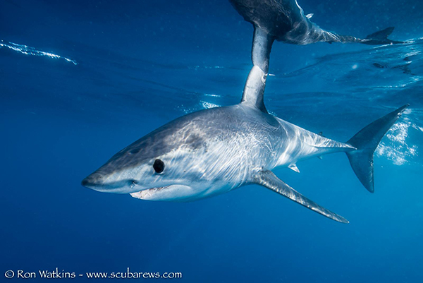 A mako shark breaks the surface with its dorsal fin. Photo: Ron Watkins, Nikon D800
