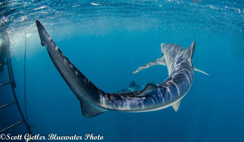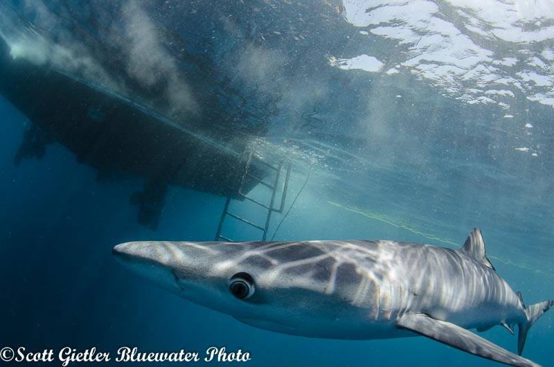 A blue shark cruises around the boat. Photo: Scott Gietler, NIkon D7000
