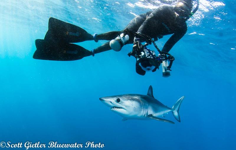 Last month, Bluewater Photo ran several trips to snorkel with sharks in open water off Southern California. This was prime season for spotting blue sharks, however with warmer water temps this year (and an El Nino on the horizon) the makos made their presence known. Â