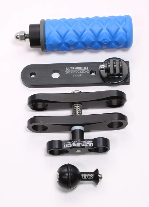 - Includes one TR-DH handle with blue grip, one TR-GP tray with GoPro tripod mount, one BA-HB ball mount, and one AC-CSL clamp.