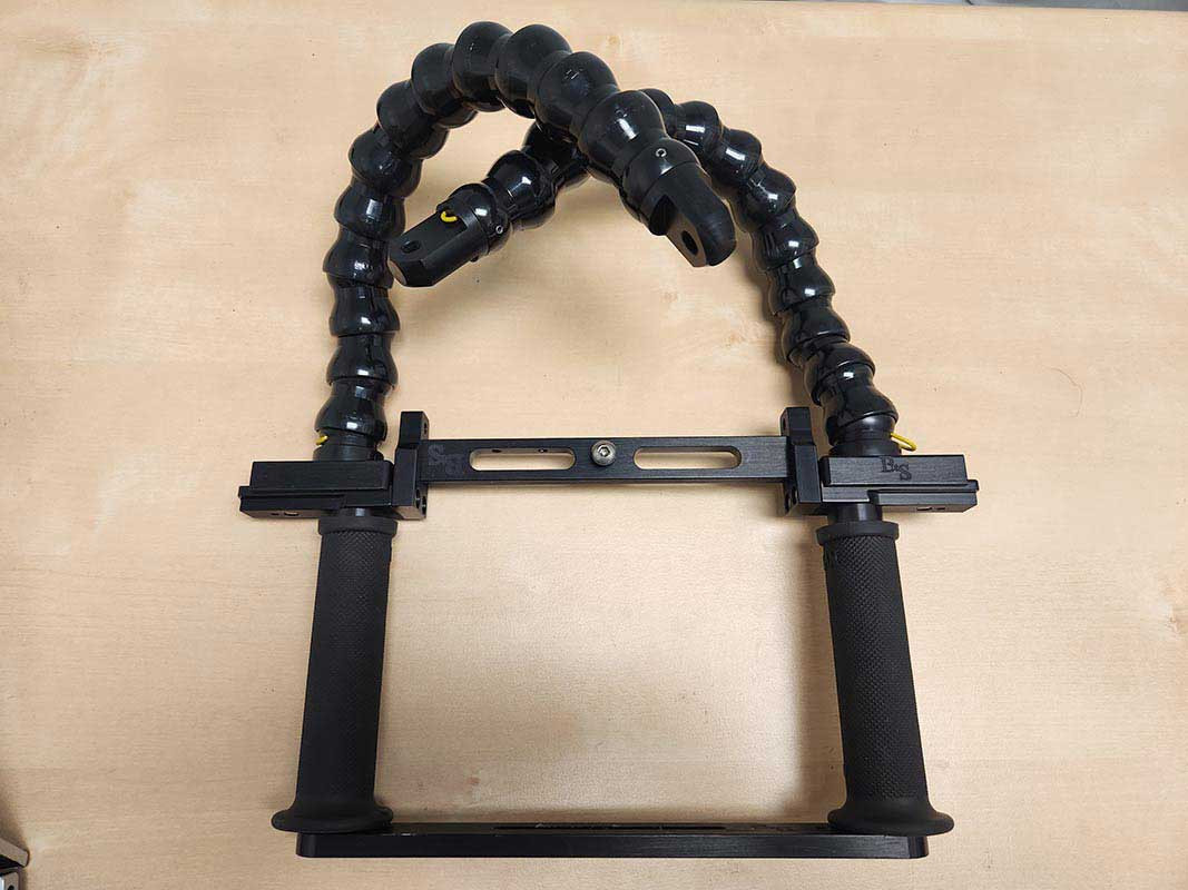 The angled GoPro tray from Beneath the Surface uses an innovative boomerang style tray to place the camera further forward. This is excellent for use with wide POV cameras like the GoPro so that you never risk accidentally getting your hand or fingers in the frame. This includes quick disconnect flex arms with a YS mount.