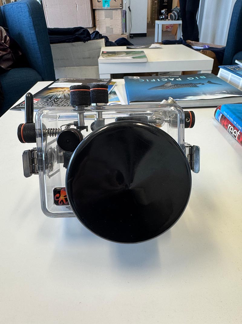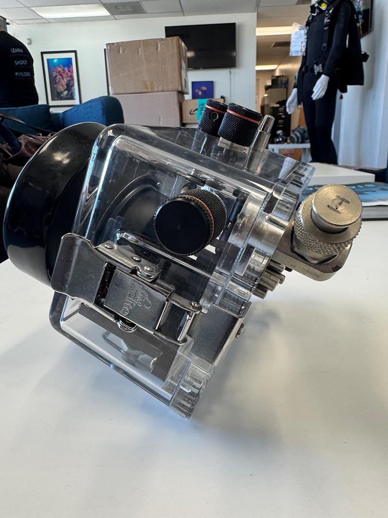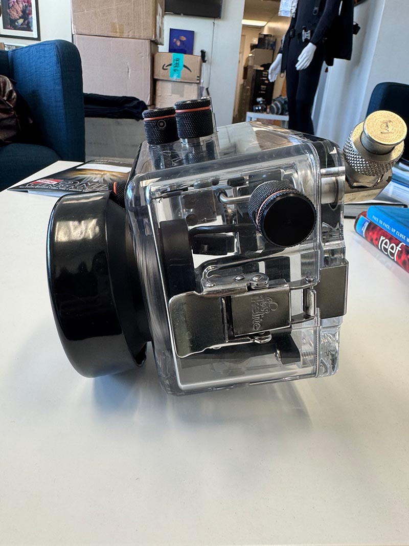 Simply close the two stainless steel locking lid snaps, and see the o-ring form a solid black, watertight seal. Large, ergonomic controls provide access to all important camera functions including front and rear dials. An included tray with soft-grip handle provides comfortable handling underwater and our signature quick release attachment system for lighting accessories.