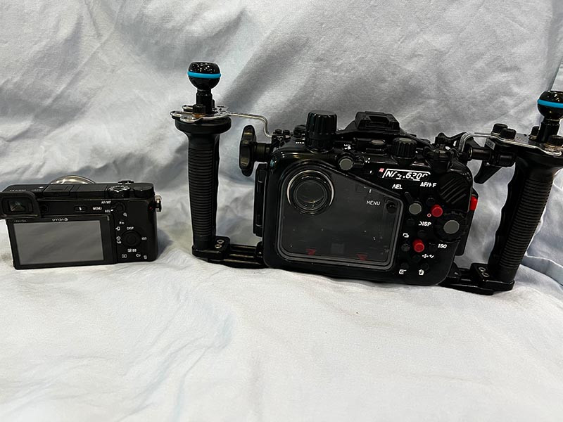 - Nauticam A6300 undetware housing (tray with ball mount for strobes, vacuum valve and pump, 2 newer camera batteries and charger, 2 64 GB SD Cards, instruction manual)