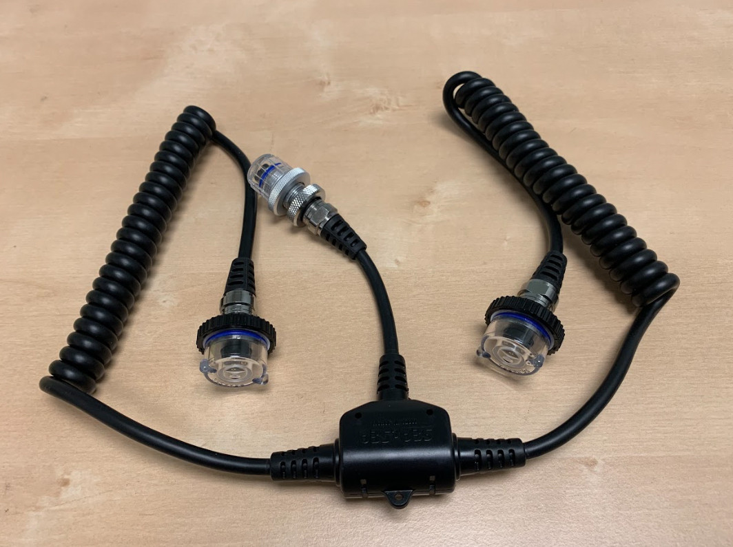 An electrical sync cord for attaching two strobes to a camera housing. This cord is a "Y" style cord.