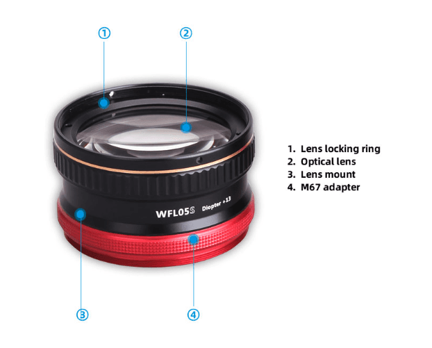 Designed for use with the latest in high quality macro lenses, the Weefine WFL05S +13 Macro Wet Lens is an underwater professional's go-to close-up lens. Optical power for underwater photography is high, allowing for close-up photography at a comfortable working distance of 60-85mm (from the front lens surface).